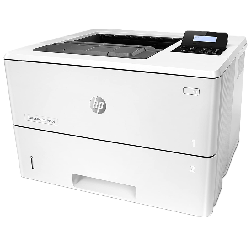 Impresora HP en blanco y negro (monocromo) A4 LaserJet PRO M501dn diseñada para grupos de trabajo con una velocidad de impresión de hasta 43 páginas por minuto (ppm). Diseño compacto y funcionamiento silencioso.